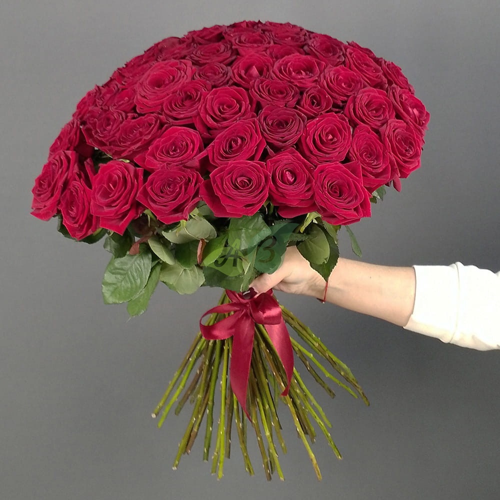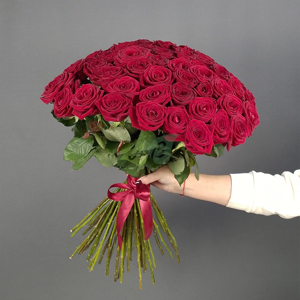 • Роза - 51 штука, цвет - красный, длина стебля - 60 см;
