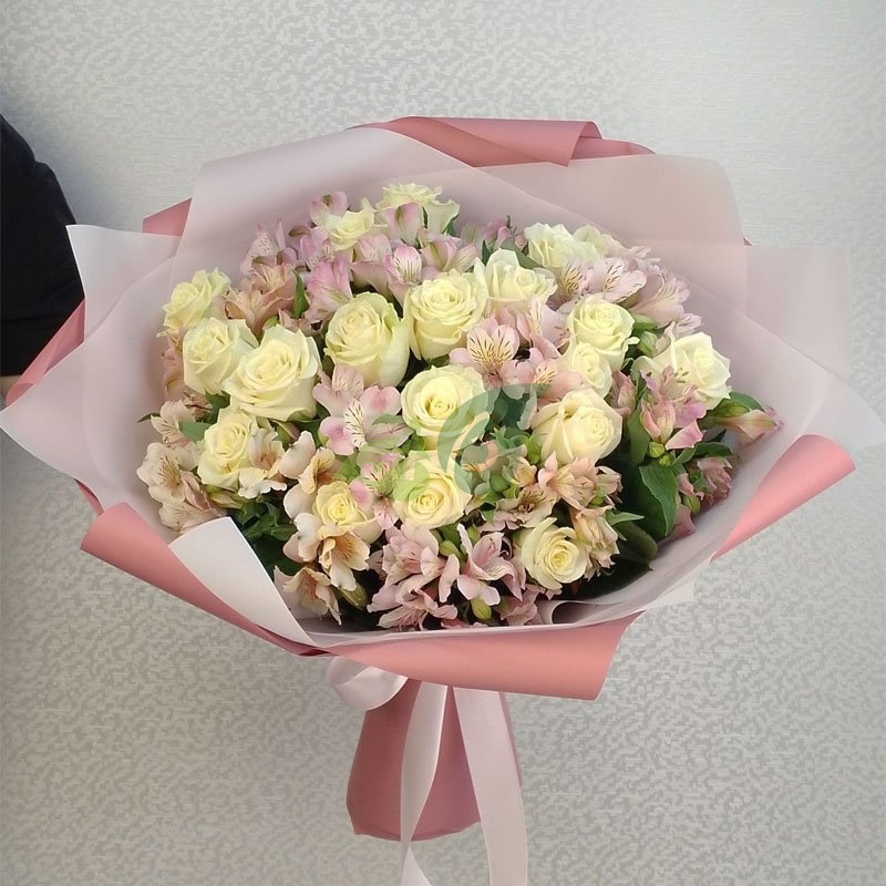 Изящный букет “Парижанка” – это свежие белые розы и розовые альстромерии в композиции на заказ с доставкой. Благодаря объемности роз и альстромерии этот букет нельзя назвать маленьким.